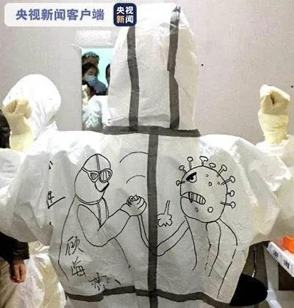 為消除孩子們的恐懼,護士在防護服上畫畫,這是江蘇支援黃石醫(yī)療隊隊員,南京市兒童醫(yī)院護士馬良超,進入隔離區(qū)前拍攝的照片。